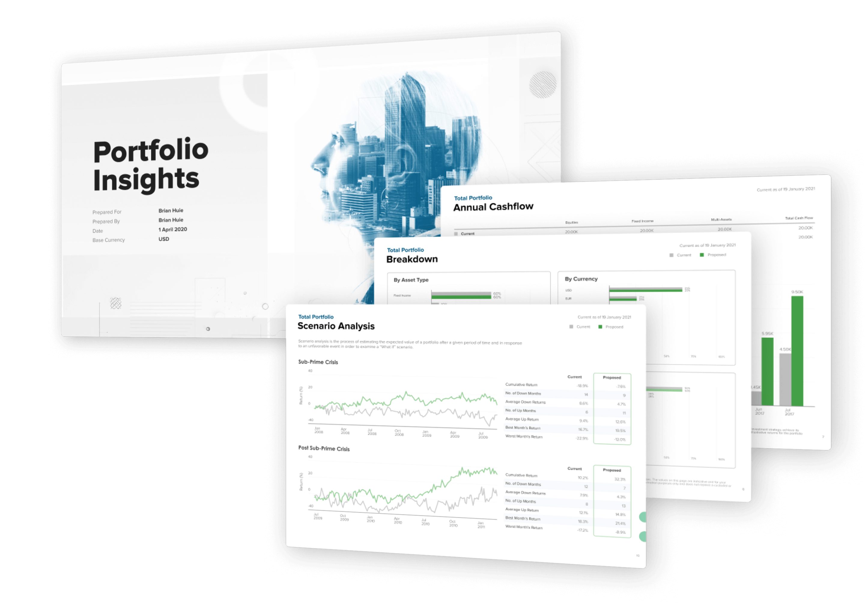 Advisors access real-time dashboards with key metrics and downloadable outputs in PDF and Excel formats. Reports are formatted for institutional use and ready for client delivery.